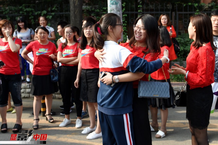 | 베이징(北京, 북경)시 후이민(回民)고등학교 시험장, 부모님들이 학생들과 포옹을 하며 학생들에게 기운을 불어넣어주고 있다. |