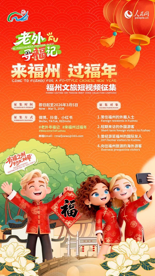 [인민망 한국어판 2월 5일] 푸저우(福州)시 문화관광국은 인민망과 공동으로 오는 3월 5일까지 '푸저우에서 행복한 새해 보내기(來福州,過福年)'를 주제로 한 문화관광 동영상 공모전을 개최한다. 푸저우와 인연이 있던 모든 외국인들의 적극적인 참여를 독려한다.